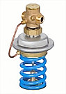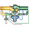 Автоматический, пропорциональный пилотный регулятор, который благодаря автоматичекиому открытию регулирующего клапана предотвращает превышение давления до себя (SAVA) и после себя (SAVD). Регулятор включает в себя две регулирующие диафрагмы, которые позволяют клапану открываться в случае неисправности одной из диафрагм. Регуляторы в основном используются в системах централизованного теплоснабжения. SAVA. Принцип действия регулятора: повышение давления передаётся по импульсным трубкам в нижнюю часть диафрагмы внутри регулятора (соединительная трубка высокого давления). Через специальный канал в регуляторе давление среды передаётся в верхнюю часть диафрагмы (соединительная трубканизкого давления). Энергия пружины начинает воздействовать на диафрагму, таким образом это позволяет устанавливать эффективный перепад давлений. SAVD. Принцип действия регулятора: импульс давления на выходе из клапана передаётся по импульсной трубке в нижнюю часть (соединительная трубка высокого давления) диафрагмы внутри регулятора. Верхняя часть (соединительная трубка низкого давления) диафрагмы соединина с атмосферой. Усилие, возникающее в пружине, передаётся на диафрагму, что позволяет устанавливать давление после клапана. |